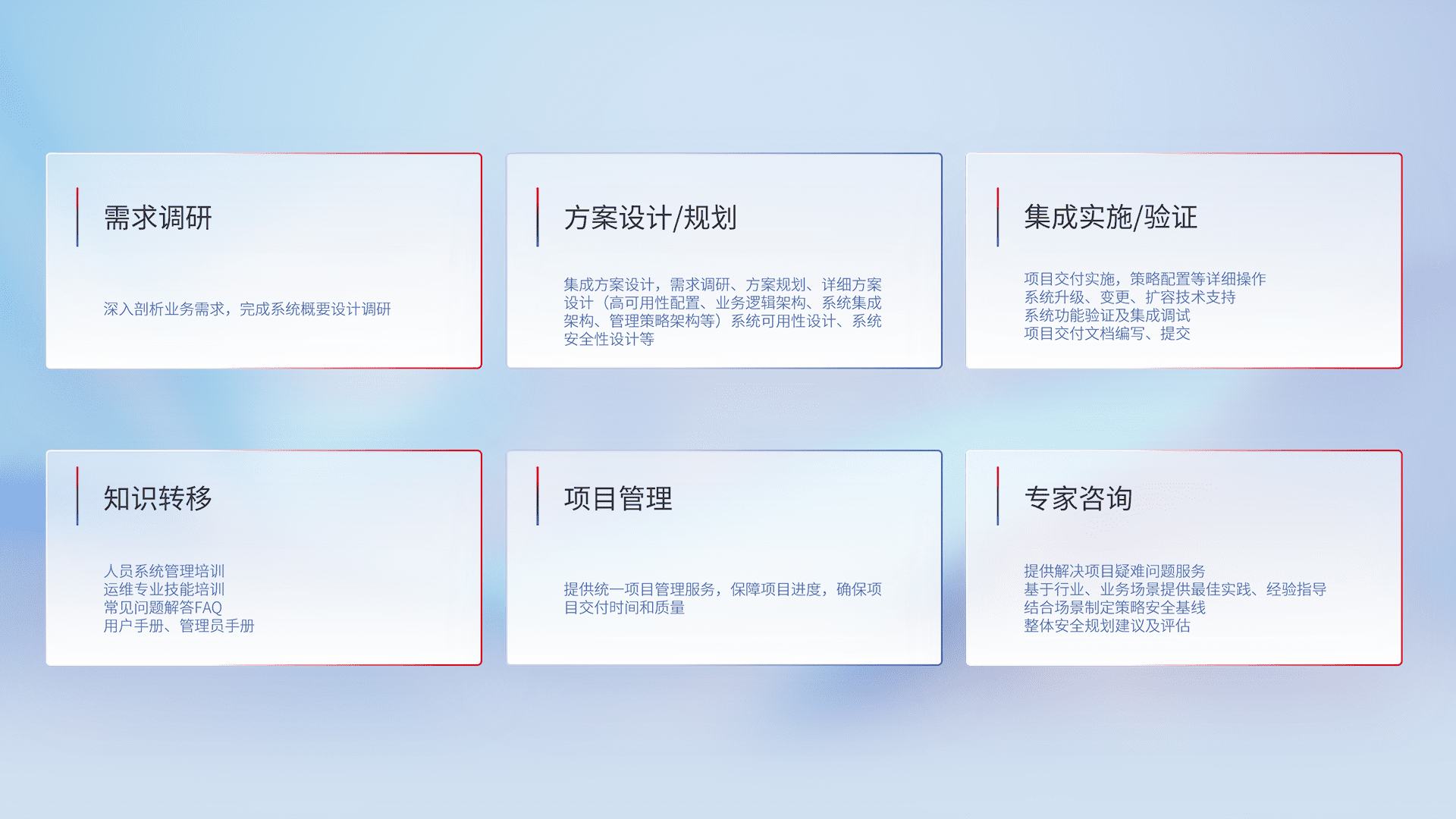 针对客户行业特性,,将宏观的安全战略和需求,,,,通过专业的交付服务,,,,实现项目落地,,,为客户提供标准规范的集成交付服务。。。